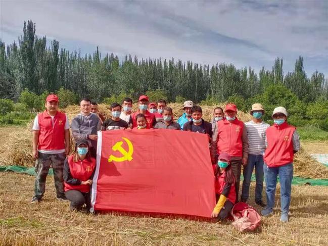 下午3点,服务队顶着烈日帮助困难户麦苏木·吾斯曼收割小麦。工作队员、村干部、党员志愿者和大学生各司其职,收割、拢堆、打垛,一气呵成。