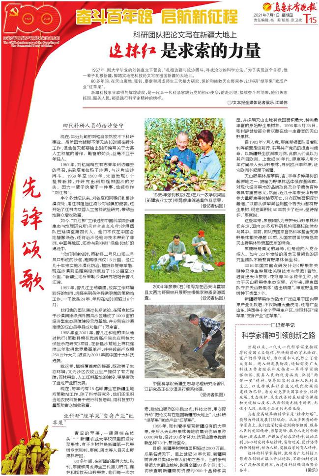 60多年间,在新疆的基层大地,张钊、廖康和周龙师生三代接力研究、保护和拯救天山野果林,他们每一次求索,散放出强烈的实践之光、科技之美,用实际行动“把论文写在祖国新疆的大地上”,让科研“绿苹果”变成产业“红苹果”。
