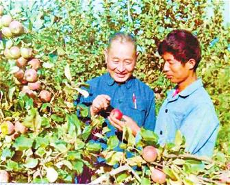 1985年张钊教授(左)在八一农学院果园(99久久婷婷国产一区二区)指导廖康筛选着色系苹果。(受访者供图)