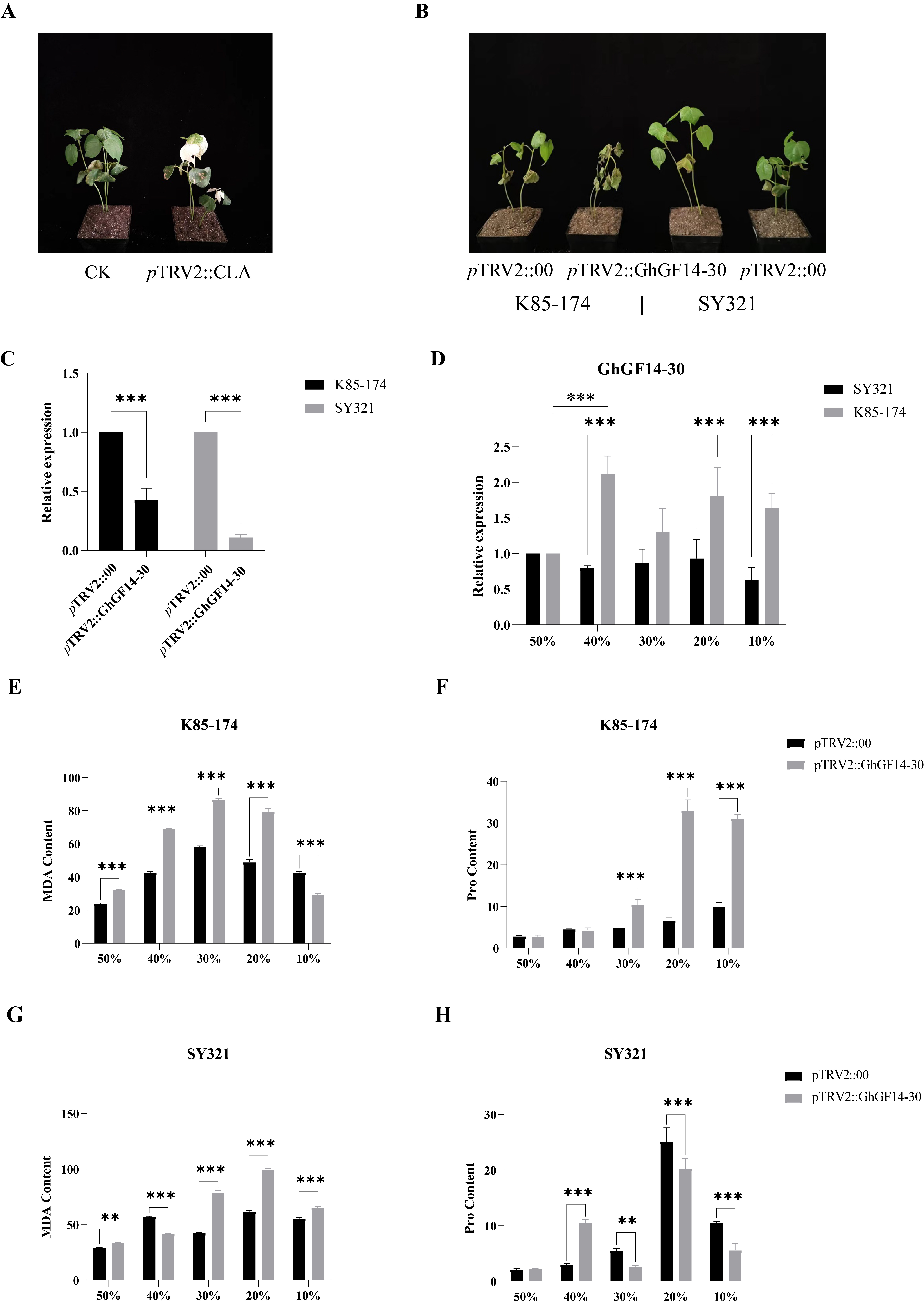 研究人员发现,GF14蛋白作为一类功能性调节蛋白,在植物中的主要功能是作为初级代谢和信号传导的关键调节因子,参与调节植物生长发育以及对逆境产生的应答。在棉花中,目前对GF14蛋白的研究报道大多聚焦于纤维发育方面。在该研究中,研究人员发现仅有的一个GF14蛋白被发现在QTL定位的峰值重叠区域,并针对GF14蛋白在棉花干旱胁迫下扮演的角色进行了探索。基于QTL定位群体本身以及极端资源材料的qRT-PCR分析发现,GhGF14-30的干旱胁迫应答较为敏感,尤其是在敏旱材料K85-174中,VIGS沉默前后的表型变化明显。证明GF14蛋白确实参与了响应棉花干旱胁迫,并在棉花应对干旱胁迫过程中可能起着重要的作用。