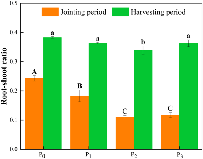 图1 拔节期和收获期羊草根冠比对不同供磷强度的响应