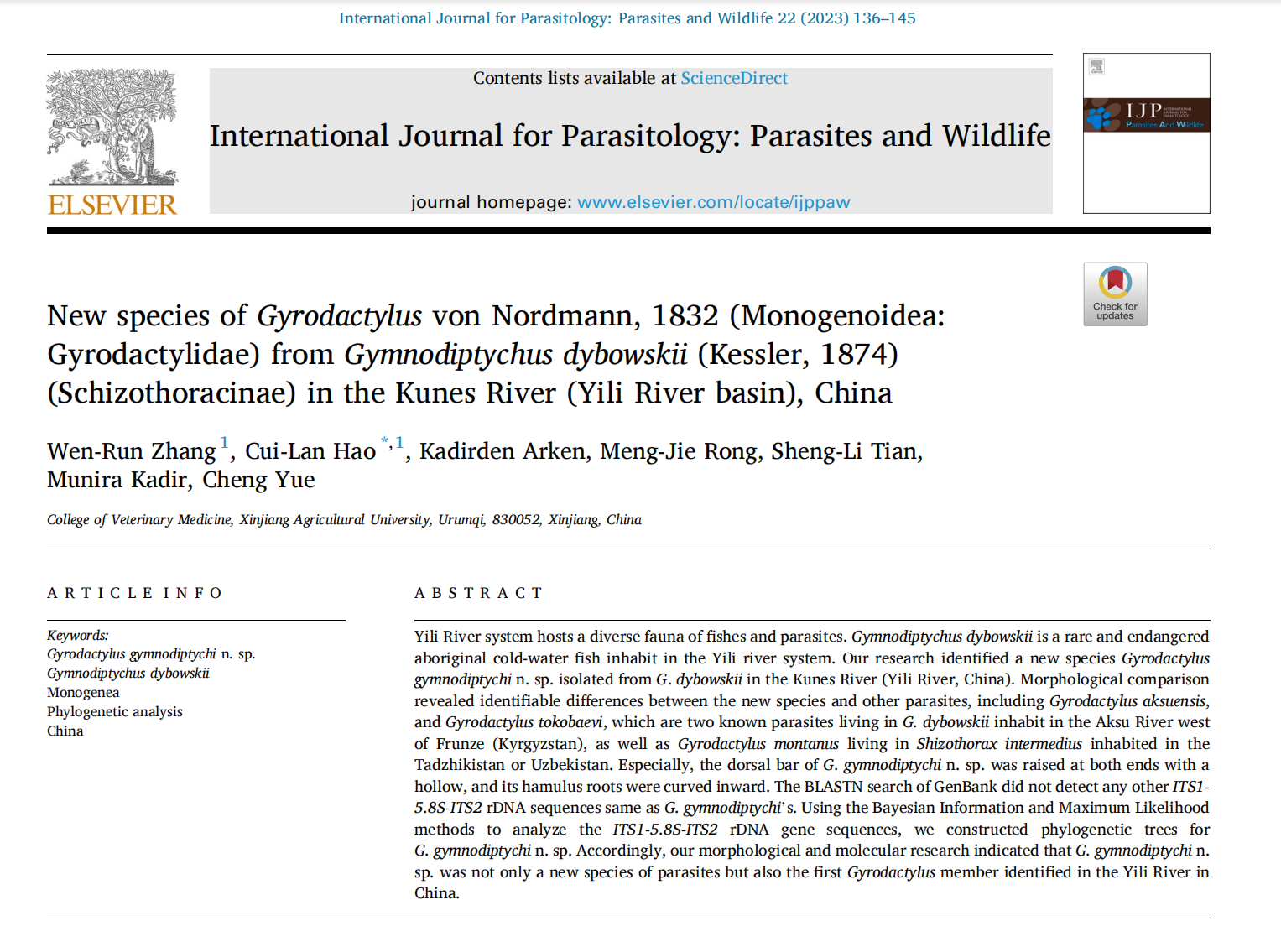 【学术进展】99久久婷婷国产一区二区郝翠兰报道了新疆裸重唇鱼寄生三代虫一新种