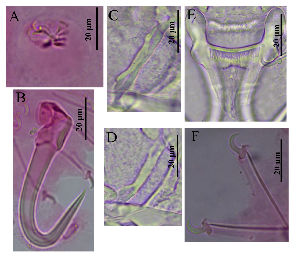 通过对裸重唇三代虫与已知三代虫的形态学特征比较发现,该虫与其他三代虫成员之间具有可识别的形态学差异。裸重唇三代虫具有钩基部弯曲且背联接片中空的独特特征,与寄生在裂腹鱼鱼类上的其他11三代虫具有明显的差异(图2。