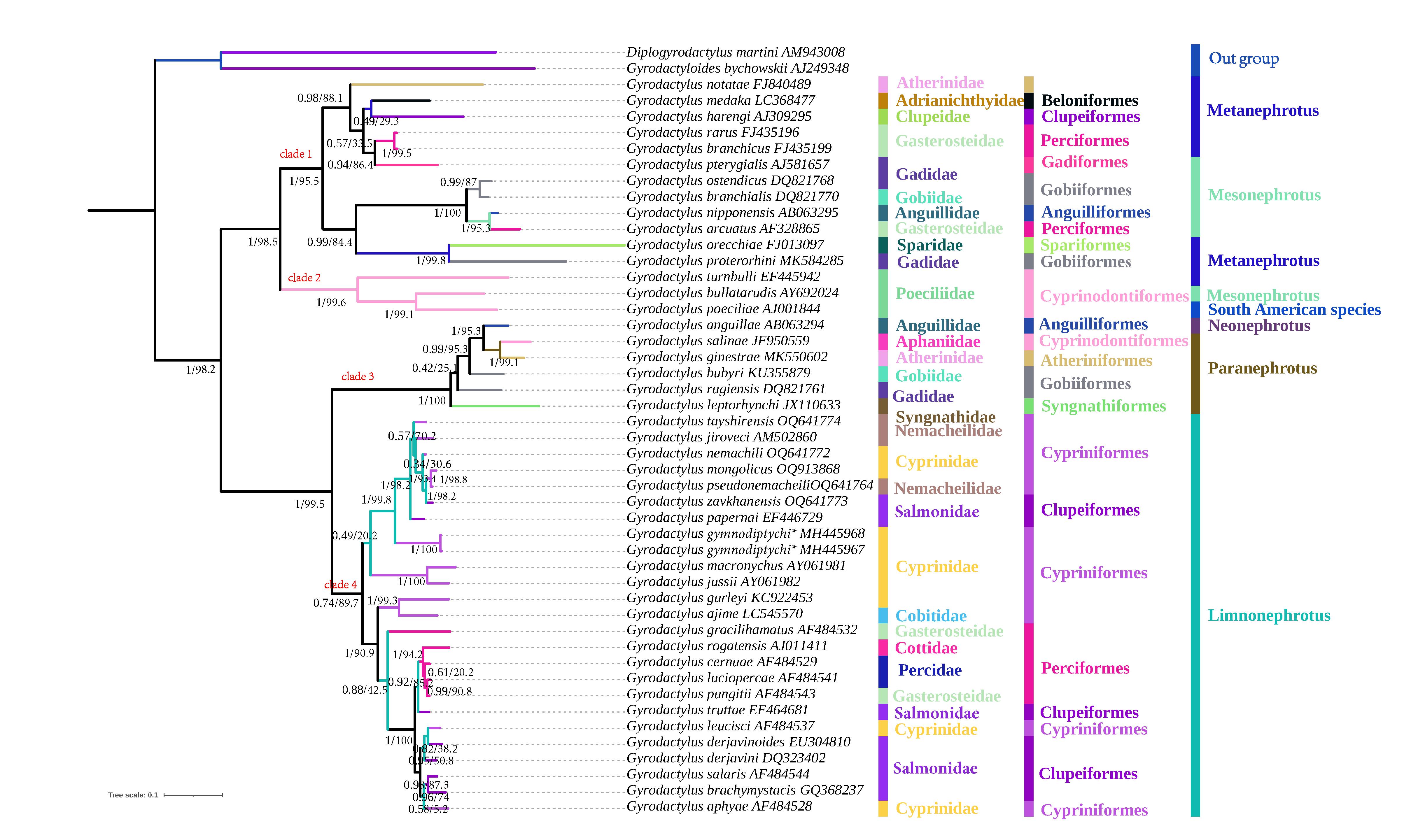 ITS1-5.8S-ITS2 rDNA片段BLASTn的结果显示,该虫的序列GenBank中的已公开的三代虫序列均不一致,利用BLASTn对该5.8s rDNA序列比对发现,裸重唇三代虫属于Limnonephrotus亚属成员。通过BIML方法构建系统发育树,结果指出所有的三代虫类群都被划分为两个主要的进化谱系,并进一步划分为四个分支。此外,裸重唇三代虫23Limnonephrotus亚属的三代虫聚为一支,与来自俄罗斯、蒙古和捷克河流的鱼类的几个三代虫成员密切相关3。