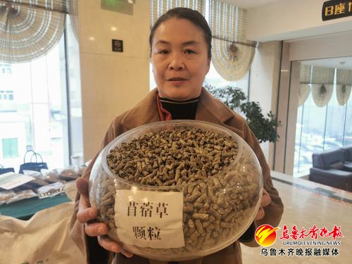 在“一带一路”饲草料产业发展高峰论坛暨首届“疆草之星”颁奖典礼上,新疆参会企业正在展示该公司生产的饲料颗粒产品。记者江斌伟摄