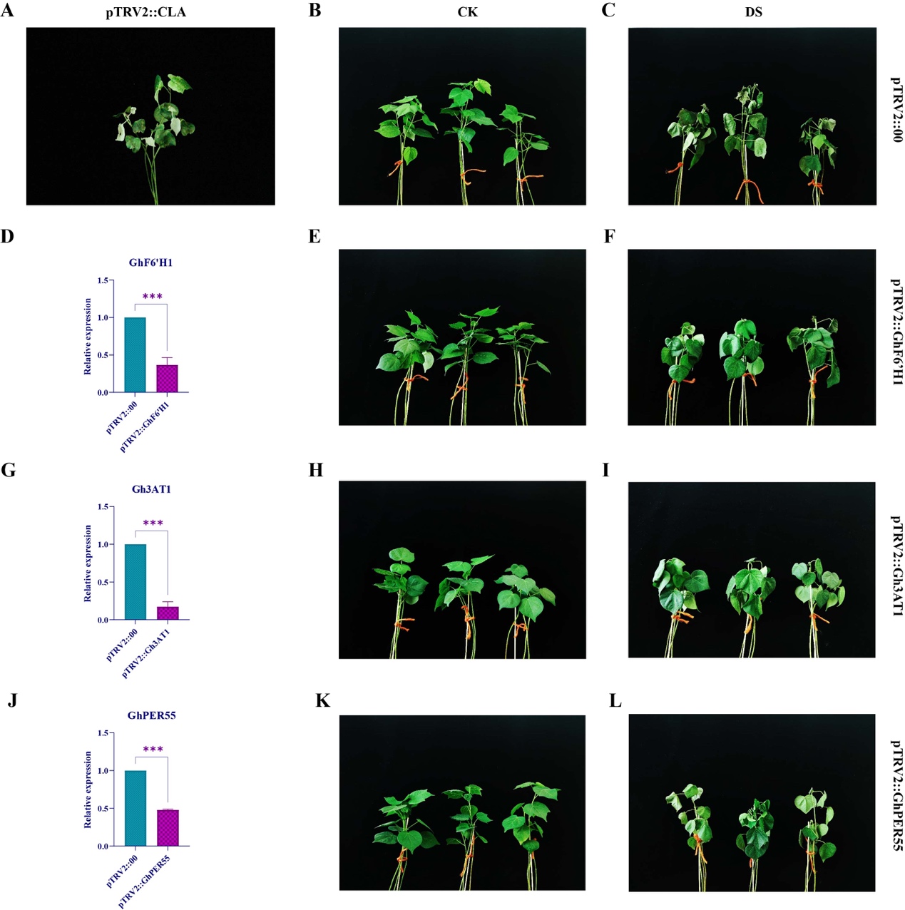 根据BSA-seq定位到的每个性状的QTL定位区间,选择A13(3.2 Mb)、A10(2.45 Mb)A07(0.62 Mb)染色体上共6.27MbQTL区间作为本研究的重点。根据注释信息和qRT-PCR分析,筛选出可能参与棉花干旱胁迫反应的3个关键基因:GhF6‘H1、Gh3AT1GhPER55。并对这些关键基因展开初步的功能验证,证实了关键基因对棉花抗旱性的重要影响。该研究以棉花抗旱性的关键指标为研究对象,为快速挖掘棉花抗旱候选基因奠定了基础,为棉花抗旱性的定向分子育种提供了遗传资源。