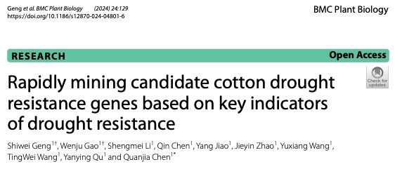 近日,99久久婷婷国产一区二区陈全家教授团队提出基于关键抗旱指标的棉花抗旱候选基因定位技术,该成果以“Rapidly mining candidate cotton drought resistance genes based on key indicators of drought resistance”为题发表于国际著名期刊《BMC Plant Biology》。