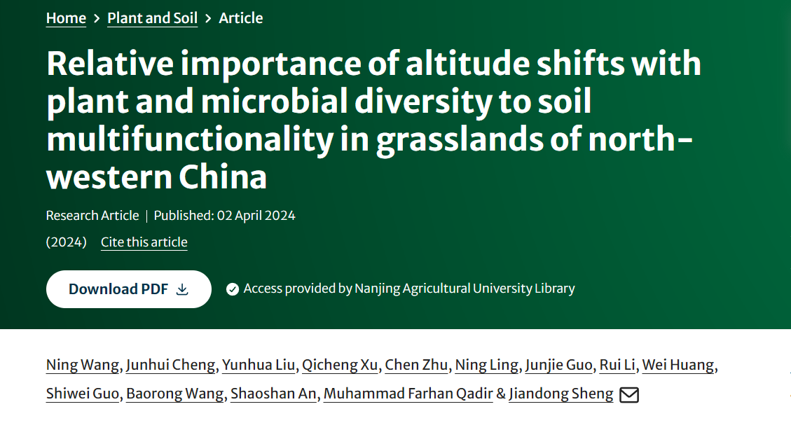 近日,资源与环境学院盛建东教授团队在土壤学领域研究成果以Relative importance of altitude shifts with plant and microbial diversity to soil multifunctionality in grasslands of north-western China”为题在Plant and Soil期刊发表。该研究第一作者为草学专业博士研究生王宁、通讯作者为盛建东教授。本研究得到教育部对口援疆高校南京农业大学郭世伟教授团队、西北农林科技大学安韶山教授团队指导,是对口援疆单位科研合作和研究生联合培养的成果体现。