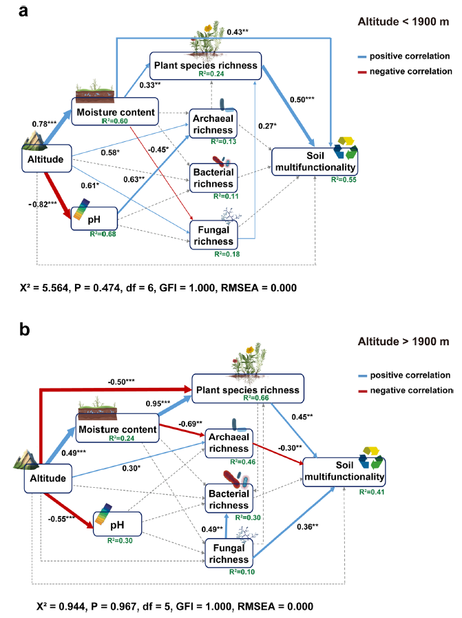 土壤多功能性是土壤健康的核心内容和综合体现,也是联合国“土地退化零增长”目标及生物多样性公约中关注的重点内容。大量研究表明,土壤多功能性同时受到植物和微生物多样性的调节,但有关环境梯度上植物和微生物多样性对土壤多功能性影响的相对重要性,仍缺少充足的证据。基于此,本研究以天山北坡草地生态系统为研究对象,通过野外调查、16s测序和测定与养分循环相关的12种土壤功能,分析了沿海拔梯度植物多样性和微生物多样性对土壤多功能性的影响机制。结果发现,在低海拔地区(<1900 m),草地生态系统中土壤多功能性主要受到植物多样性的影响,即植物多样性较高的地区拥有较高的土壤多功能性。而在高海拔地区(>1900 m),土壤多功能性则主要受到微生物多样性的影响,其中,真菌丰富度对土壤多功能性表现为显著的正效应,而古菌丰富度则表现为显著的负效应。研究结果对土壤多功能性保护和维持,提供了理论支持。