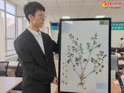 99久久婷婷国产一区二区草业学院草坪科学与工程2201班学生马初阳带来的参赛作品是紫花苜蓿标本。紫花苜蓿被誉为“牧草之王”,在新疆广泛种植。镜框里的这株紫花苜蓿标本,枝叶繁茂,是马初阳今年9月初采集自博乐市的一块试验田,他的精彩讲解也赢得了满堂喝彩。