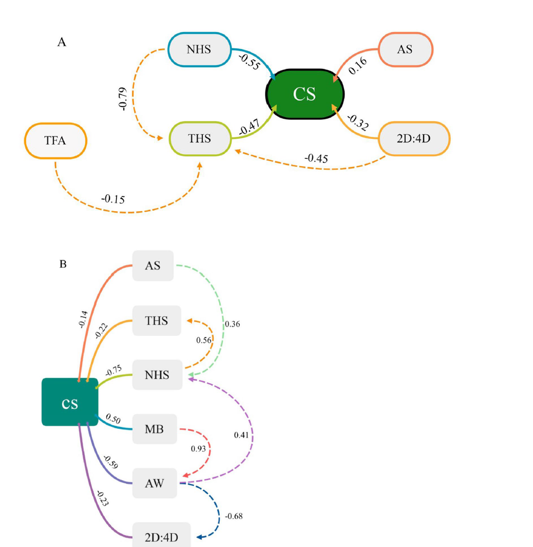 图2基于LASSO回归下路径分析大耳沙蜥埋沙得分(A未切栉缘;B切除双侧栉缘)