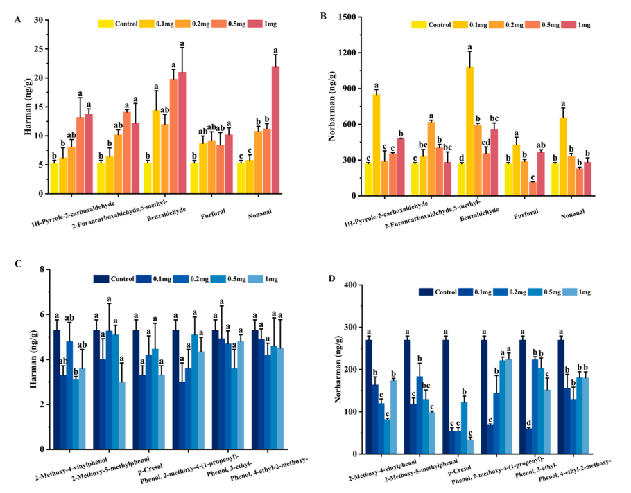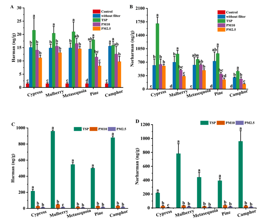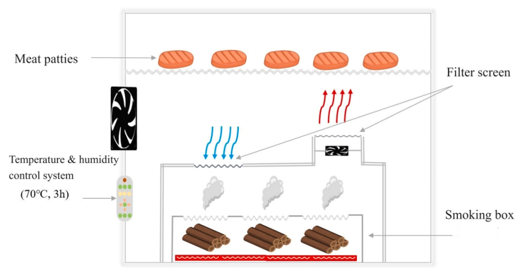 研究团队首先使用不同种类的木材进行烟熏实验,测量了烟熏肉饼中β-CHAs的浓度。随后,通过气相色谱-质谱联用技术(GC-MS)和多元统计分析,识别了与β-CHAs积累相关的挥发性有机化合物(VOCs),并建立一个化学模拟体系来探究VOCs对β-CHAs形成的影响。研究中一个重要创新点是使用了不同孔径大小的过滤器来拦截和净化烟雾颗粒。