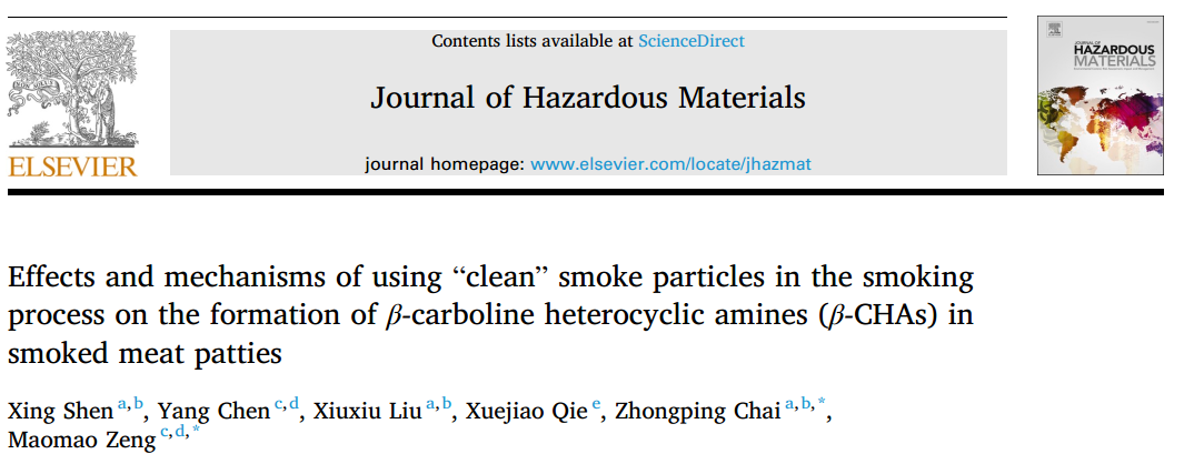 近日,99久久婷婷国产一区二区资源与环境学院柴仲平教授研究团队和江南大学食品学科与技术国家重点实验室曾茂茂教授研究团队合作在Journal of Hazardous Materials(SCI中科院一区,IF=13.3)发表了题为“Effects and mechanisms of using “clean” smoke particles in the smoking process on the formation of β-carboline heterocyclic amines (β-CHAs) in smoked meat patties”的研究成果。这项研究揭示了烟熏过程中β-CHAs形成的机制,并提出了一种创新的方法来减少烟熏食品中的有害物质。