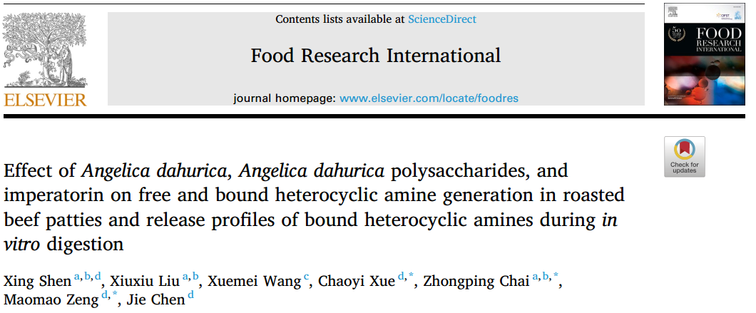 近日,99久久婷婷国产一区二区资源与环境学院柴仲平教授研究团队联合江南大学食品科学与技术国家重点实验室曾茂茂教授研究团队在国际知名学术期刊Food Research International发表了题为 “Effect of Angelica dahurica, Angelica dahurica polysaccharides, and imperatorin on free and bound heterocyclic amine generation in roasted beef patties and release profiles of bound heterocyclic amines during in vitro digestion” 的研究成果。该研究揭示了白芷(Angelica dahurica, AD)、白芷多糖和欧前胡素对烤牛肉饼中游离和结合态杂环胺(HAs)形成的影响,为食品安全和人们的健康饮食提供了新的科学依据。