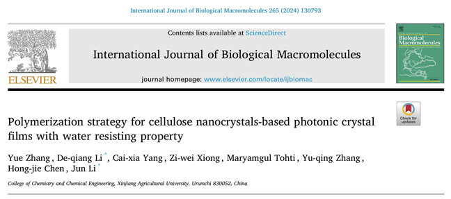 Abstract: Cellulose nanocrystals (CNCs) can form a liquid crystal film with a chiral nematic structure by evaporative-induced self-assembly (EISA). It has attracted much attention as a new class of photonic liquid crystal material because of its intrinsic, unique structural characteristics, and excellent optical properties. However, the CNCs-based photonic crystal films are generally prepared via the physical crosslinking strategy, which present water sensitivity. Here, we developed CNCs-g-PAM photonic crystal film by combining free radical polymerization and EISA. FT-IR, SEM, POM, XRD, TG-DTG, and UV–Vis techniques were employed to characterize the physicochemical properties and microstructure of the as-prepared films. The CNCs-g-PAM films showed a better thermo-stability than CNCs-based film. Also, the mechanical properties were significantly improved, viz., the elongation at break was 9.4 %, and tensile strength reached 18.5 Mpa, which was a much better enhancement than CNCs-based film. More importantly, the CNCs-g-PAM films can resist water dissolution for more than 24 h, which was impossible for the CNCs-based film. The present study provided a promising strategy to prepare CNCs- based photonic crystal film with high flexibility, water resistance, and optical properties for applications such as decoration, light management, and anti-counterfeiting.