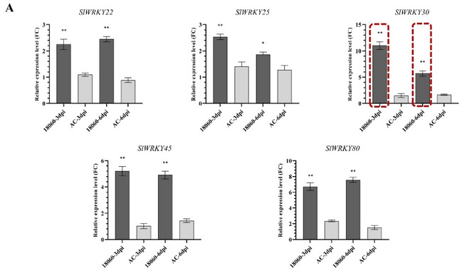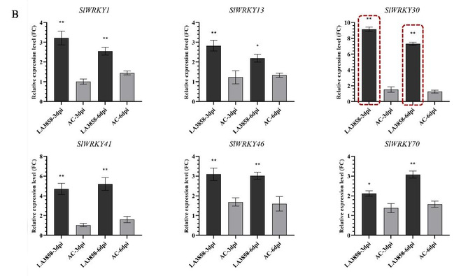 通过对筛选的目标SlWRKYs基因进行根部表达模式鉴定,重点关注SlWRKY30。在Mi-1番茄的3 dpi阶段,SlWRKY30的表达显著上调,增加了11.02倍,较其它SlWRKYs呈现最大增幅。在6 dpi阶段,其表达倍数降至5.70。同样,在Mi-3番茄的3 dpi阶段,SlWRKY30差异倍数增加高达9.15倍,而在6 dpi阶段,仍表现出7.31倍的差异表达。