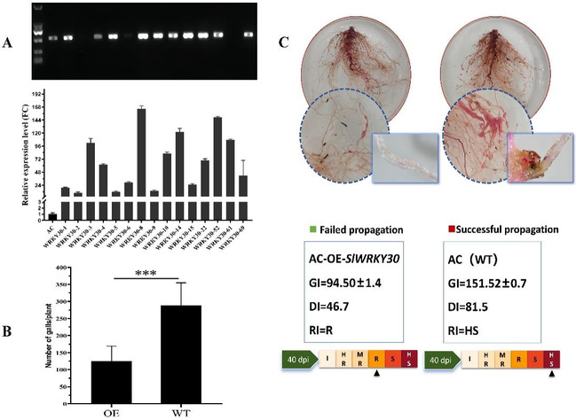 再对超表达T2代株系中SlWRKY30的表达水平进行测定,最终选择表达水平增加超过100倍的阳性株进行后续接种实验。结果显示,超表达株系的平均根结数量为125.2,显著低于野生型WT(288.7)。超表达株系的GI和DI分别为94.50和46.7,显著低于WT(GI=151.52,DI=81.5)。综合统计,超表达株系的抗性水平提高了两个等级,从高感HS提升到了抗病R。结合VIGS结果,SlWRKY30具有正向调控作用,其表达增强了番茄对根结线虫病的抗性。同时,亚细胞定位结果也进一步证明SlWRKY30作为核定位基因发挥相关功能。